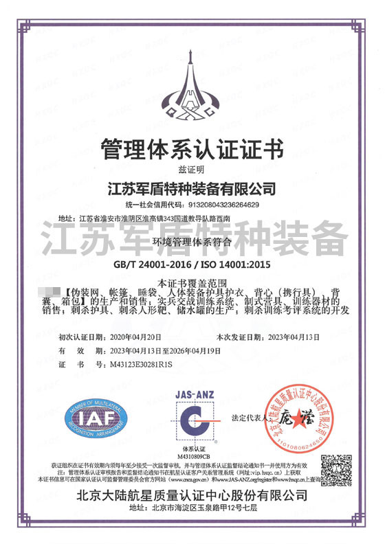 环境管理体系认证证书